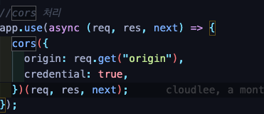 그리고 credential true설정을 통해 프론트에서는 헤더에 withCredential: true를 헤더에 담아 사용하고 있다.