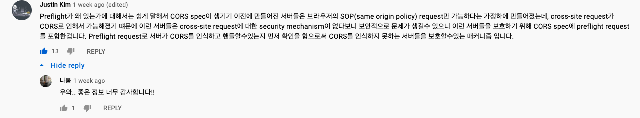 만약 preflight request가 서버로 전송을 하였을 때 CORS를 인식하지 못하는 서버라면 제대로 된 응답(response)를 보내지 못하게 되고 그렇게 되면 실제 client로 부터의 요청(request)도 전송되지 않게 되어 preflight 가 cross-origin 요청(request)에 대비 되지 않은 서버를 보호해주게 된다.